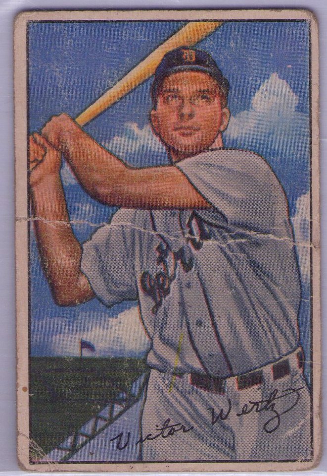Vic Wertz from the 1952 Bowman set. I snagged this one off of the Ebays for less than two bucks shipped. I consider that quite a deal since he's in a Tigers uniform and Mr.Wertz actually had a respectable career: 17 MLB seasons, a few all-star appearances, his name even tossed around in HOF voting. Sure, the card is so thin it almost feels like a threadbare T-shirt and there's that big crease in the middle, as if the previous owner liked to make Vic bow to the empty stands in the background. All that wear just makes me dig this card more. This was such a great set for Bowman. I miss the hell out of Bowman Heritage.